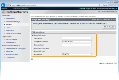 Marker afkrydsningsfeltet [Brug SMB-server], og angiv de påkrævede indstillinger.