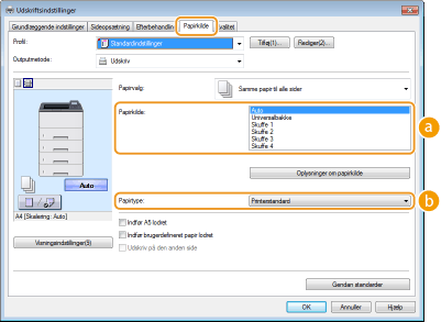 Papirkilden vælges automatisk i henhold til det angivne format og den angivne type af det papir, der skal udskrives på, og de indstillinger, der er konfigureret i maskinen.