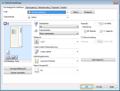 Du kan nemt angive sidelayoutet, indbindingspositionen osv. på en intuitiv måde på eksempelbilledet. Du kan få flere oplysninger ved at klikke på [Hjælp] på skærmen for printerdriveren.