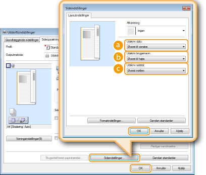 Vælg udskriftsplaceringen af udskriftsdatoen, brugernavnet eller sidetallet