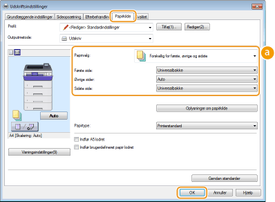 Du kan også angive papiret for den side, der følger efter omslaget, samt angive papiret i [Forskellig for første, øvrige og sidste]. Du kan også udskrive ved at angive papirtypen i [Papirtype].