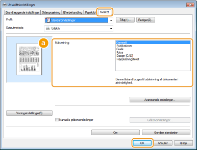 Vælg en indstilling, der passer til dokumenttypen eller formålet med udskrivningen. Du kan f.eks. vælge [Generelt] til generel brug eller vælge [Fotos], når du vil udskrive fotobilleder i optimal udskriftskvalitet.