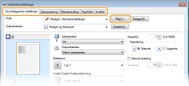 Klik på fanerne [Grundlæggende indstillinger], [Sideopsætning], [Efterbehandling], [Papirkilde] eller [Kvalitet] for at angive udskriftsindstillingerne på hver enkelt skærm efter behov.