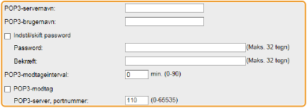 Angiv intervallet i minutter for automatisk oprettelse af forbindelse til mailserveren. Nye e-mails i mailserverens indbakke modtages automatisk og udskrives med de angivne tidsintervaller. Du kan også angive denne indstilling ved at bruge <POP3-modtag.interval> i indstillingsmenuen i kontrolpanelet (