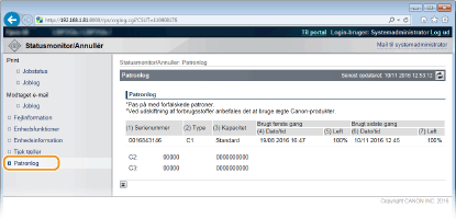 Historikken med op til 2.000 udskrevne dokumenter, der er lagret i maskinen, vises (kun, hvis SD-kortet er installeret).
