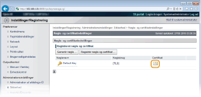 Klik på [Nøgle- og certifikatindstillinger] for at bekræfte et nøglepar eller [CA-certifikatindstillinger] for at bekræfte et CA-certifikat.