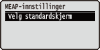 Innstillingselementene om hovedskjermen på MEAP er oppført med korte beskrivelser. Standardinnstillinger er merket med en dolk (