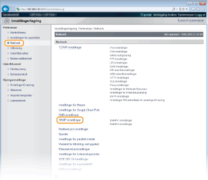 Du kan også få tilgang til SNMP-innstillinger via innstillinger-menyen på betjeningspanelet. SNMP-innstillinger