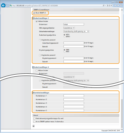 Hvis begge versjoner av SNMP er aktivert, anbefales det at MIB-tilgangstillatelsen i SNMPv1 angis til [Kun lese]. MIB-tilgangstillatelsen kan angis uavhengig i SNMPv1 og SNMPv3 (og for hver bruker i SNMPv3). Ved å velge [Lese/skrive] (full tilgangstillatelse) i SNMPv1 oppheves de robuste sikkerhetsfunksjonene som er et kjennetegn i SNMPv3, fordi de fleste av maskininnstillingene dermed kan kontrolleres med SNMPv1.