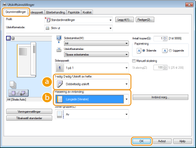 Du lage både enkeltsidige og dobbeltsidige utskrifter. Standardinnstillingen er [Dobbeltsidig utskrift]. Innstillingen kan endres etter behov.