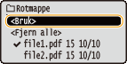 Hvis du velger <Sorter filer> på skjermen i trinn 1, kan du endre rekkefølgen for visning av filer når du velger filen som skal skrives ut.