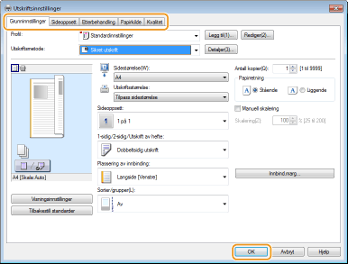 Klikk på kategoriene [Grunninnstillinger], [Sideoppsett], [Etterbehandling], [Papirkilde] eller [Kvalitet] for å angi utskriftsinnstillingene på hver skjerm ved behov.