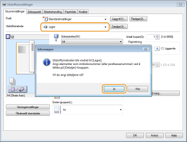 Velg [Lagre] i [Utskriftsmetode], og klikk på [Ja].