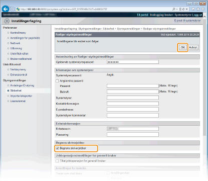 Når utskriftsfunksjonene er begrensetBare utskrift av lagrede jobber kan utføre fra skriverdriverne. Skrive ut et dokument som er lagret i maskinen (utskrift av lagret jobb)