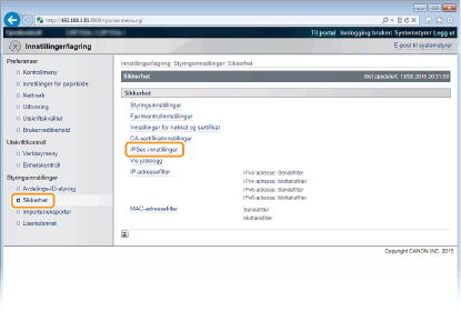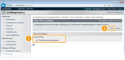 Bruke betjeningspaneletDu kan også aktivere eller deaktivere IPSec-kommunikasjon via innstillinger-menyen på betjeningspanelet. IPSec