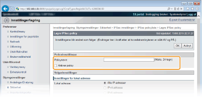 Før du konfigurerer innstillinger for IPSec-kommunikasjonKontroller IPSec-innstillingene i operativsystemet som maskinen vil kommunisere med. En feil kombinasjon av operativsysteminnstillinger og maskinens innstillinger vil deaktivere IPSec-kommunikasjonen.