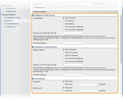 Velg å angi én enkelt IPv6-adresse eller et område med IPv6-adresser for å bruke IPSec. Angi IPv6-adressen (eller området) i tekstboksen [Adresser som skal angis manuelt].