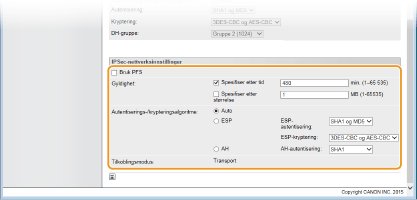 ESP aktiveres og krypteringsalgoritmen er angitt som [3DES-CBC og AES-CBC].