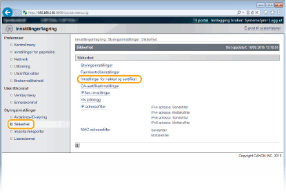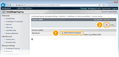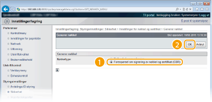 Et nøkkelpar kan genereres med maskinen når det er nødvendig for kryptert kommunikasjon via Transport Layer Security (TLS). Du kan bruke TLS når du har tilgang til maskinen via Fjernkontroll eller utføre IPP-utskrift. Opptil åtte nøkkelpar, inklusive de forhåndsinstallerte parene, kan registreres. Egensignerte sertifikater brukes med nøkkelpar generert i "Nettverkskommunikasjon". Med en "Nøkkel og forespørsel om signering av sertifikat (CSR)" kan du søke om et CA-utstedt digitalt sertifikat for nøkkelparet generert av maskinen.