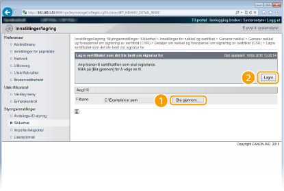 Klikk på [Bla gjennom] i [Filbane], angi filen for forespørselen om sertifikatsignering og klikk på [Lagre].