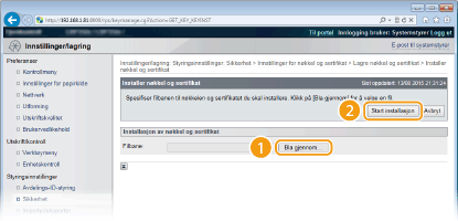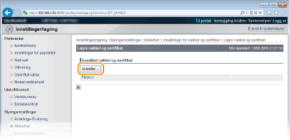 Klikk [Innstillinger for nøkkel og sertifikat] for å installere et nøkkelpar eller [CA-sertifikatinnstillinger] for et CA-sertifikat.