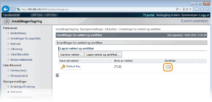Klikk [Innstillinger for nøkkel og sertifikat] for å bekrefte et nøkkelpar eller [CA-sertifikatinnstillinger] for et CA-sertifikat.