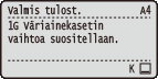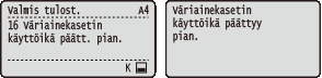 Kun ilmoitus <Väriainekasetin käyttöikä päättyy pian.> tulee esiin, tulostus pysäytetään tilapäisesti. Voit jatkaa tulostusta painamalla
