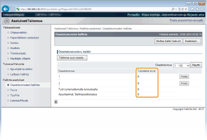 Tarkistuksen tuloksen tulostaminenSivulaskurin nollaaminenKun haluat nollata kunkin osaston sivumäärän, napsauta tekstilinkkiä kohdassa [Osastotunnus] ja napsauta [Nollaa laskuri]