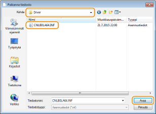 Määritä kansio, jossa tulostinajurit ovat, valitse INF-tiedosto ja napsauta [Avaa].