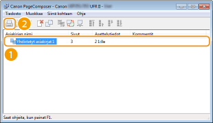 Canon PageComposer -ohjelmalla voit yhdistää useita asiakirjoja yhdeksi tulostustyöksi ja tulostaa työn määritetyillä tulostusasetuksilla. Tämän toiminnon avulla voit esimerkiksi yhdistää eri sovelluksilla luotuja asiakirjoja ja tulostaa kaikki sivut samankokoiselle paperille.