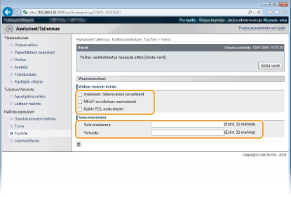 Kun haluat viedä niiden kohteiden asetustiedot, jotka voidaan asettaa portaalisivun kohdassa [Asetukset/Tallennus], valitse kyseisten kohteiden valintaruudut.