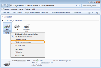 Napsauta tulostimen kuvaketta hiiren kakkospainikkeella ja valitse [Tulostimen ominaisuudet] tai [Ominaisuudet].