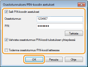 Aseta PIN-koodi valitsemalla tämä valintaruutu ja syöttämällä enintään seitsemän merkin mittainen numero kenttiin [PIN] ja [Vahvista].