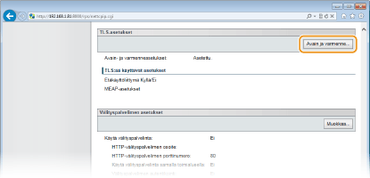 Jos [Etäkäyttöliittymän asetukset] tai [IPP-tulostusasetukset] on jo ottanut TLS:n käyttöön, viestiä [Oletusavainasetukset] ei näytetä. Jos haluat vaihtaa käytettävän avaimen, katso vaihe 6 ja tyhjennä [Käytä TLS:ää]-valintaruudut kohdassa [Etäkäyttöliittymän asetukset] tai [IPP-tulostusasetukset].