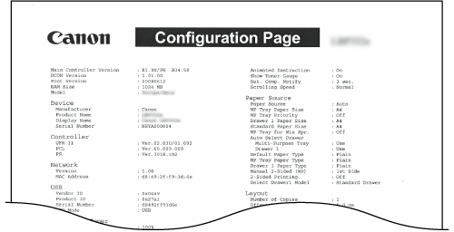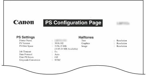 En lista skrivs ut med inställningarna för att använda PS-läget och interna informationsobjekt som har registrerats i enheten.