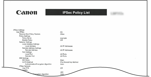 Du kan kontrollera listan med principnamn och de IPSec-inställningar som registrerats i enheten genom att skriva ut en IPSec-principlista.