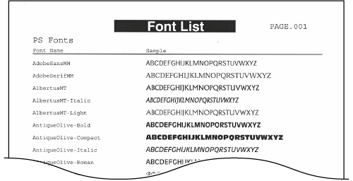 Du kan kontrollera en lista med tillgängliga teckensnitt i PS-läge.