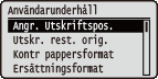 Inställningar för justeringar i enheten, t.ex. justering av utskriftspositioner i olika papperskällor och ökad utskriftskvalitet, visas med korta beskrivningar. Du kan ange dessa inställningar när enheten är offline. Standardinställningarna är markerade med ett kors (