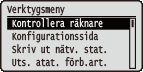 Du kan visa totala antalet utskrivna sidor samt skriva ut intern systeminformation. När du trycker på  (  ) på kontrollpanelen visas menyn Verktyg. Du kan ange inställningarna som beskrivs nedan när enheten är offline.