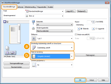 Skriver ut ett dokument så att de utskrivna sidorna öppnas åt vänster efter bindningen.