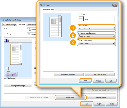 Välj utskriftsposition för utskriftsdatum, användarnamn och sidnummer