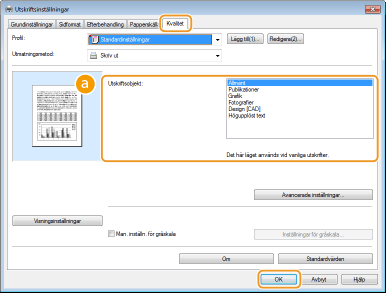 Välj ett alternativ som passar dokumenttypen eller ändamålet med utskriften. Du kan till exempel välja [Allmänt] för normalt bruk eller [Fotografier] du vill skriva ut fotografier med optimal kvalitet.