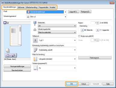 Klicka på fliken [Grundinställningar], [Sidformat], [Efterbehandling], [Papperskälla], eller [Kvalitet] för att ange utskriftsinställningar på de olika skärmarna efter behov.