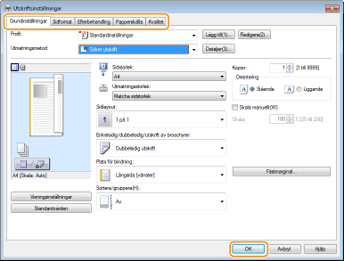 Klicka på fliken [Grundinställningar], [Sidformat], [Efterbehandling], [Papperskälla] eller [Kvalitet] för att ange utskriftsinställningar på de olika skärmarna efter behov.