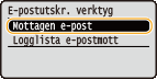 Om e-postutskrift från POP3-servern har aktiverats kan du även hämta och skriva ut e-postmeddelanden manuellt. Om du vill ansluta till e-postservern innan du tar emot e-post automatiskt, eller om enheten är konfigurerad för att förhindra automatisk hämtning av e-post, gör du på nedanstående sätt för att hämta e-post manuellt.