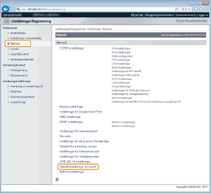 Markera kryssrutan för att aktivera e-postutskrift via SMTP-protokollet. Du kan även ange den här inställningen med <SMTP RX> på kontrollpanelens inställningsmeny (