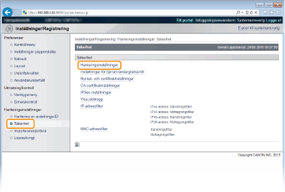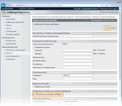 Du kan ange inställningar så att användare kan radera eller avbryta utskrifter av dokument även i läget för allmänna användare i fjärranvändargränssnittet.