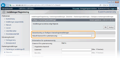 Ange lösenordet för systemansvarig i [Aktuellt lösenord för systemansvarig].