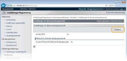 Du kan även aktivera eller inaktivera TLS-krypterad kommunikation på kontrollpanelens inställningsmeny. Inst. fjärr gränssn.