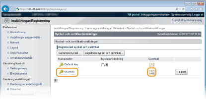 Ett nyckelpar kan inte tas bort om det används för något syfte, t.ex. när "TLS" eller "IEEE 802.1X" visas under [Nyckelanvändning]. Inaktivera i så fall funktionen eller byt ut nyckelparet innan du raderar det.